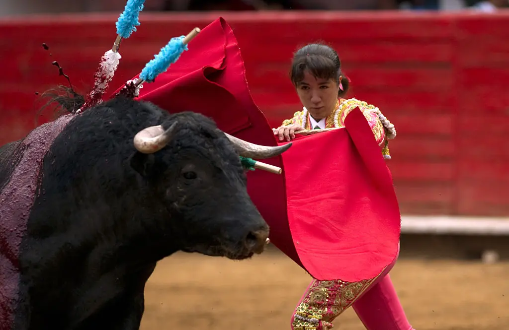 Tenorio can be seen waving a pink and yellow cape at the animal as it charges towards her. The bull then proceeds to hit the bullfighter, dragging her into the side of the stadium.