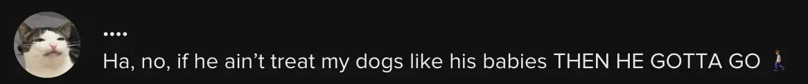 "Ha, no, if he ain't treat my dogs like his babies THEN HE GOTTA GO," one person wrote.