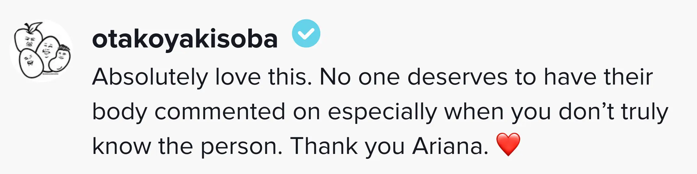 Naturally, people were very supportive of the singer, as one person expressed: "Absolutely love this. No one deserves to have their body commented on especially when you don’t truly know the person. Thank you Ariana."