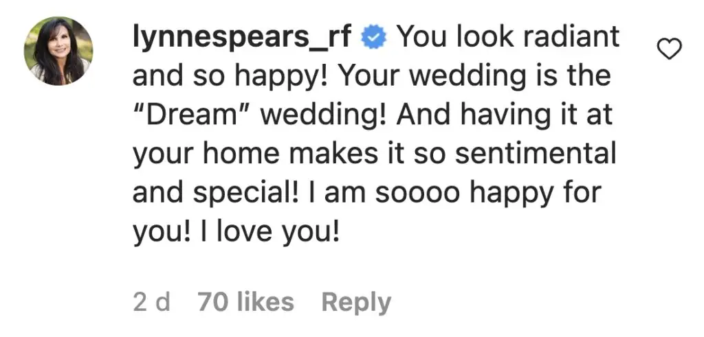 That didn't stop Lynne Spears from congratulating the newlyweds in a comment, where she wrote: "You look radiant and so happy! Your wedding is the 'Dream' wedding! And having it at your home makes it so sentimental and special! I am soooo happy for you! I love you!"