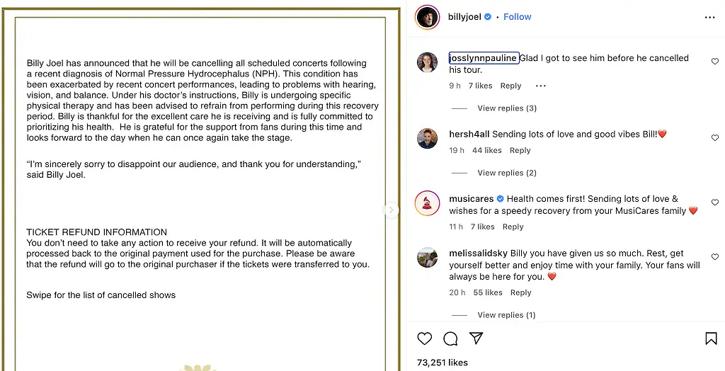 "Billy Joel has announced that he will be cancelling all scheduled concerts following a recent diagnosis of Normal Pressure Hydrocephalus (NPH)," they penned. “Under his doctor's instructions, Billy is undergoing specific physical therapy and has been advised to refrain from performing during this recovery period."