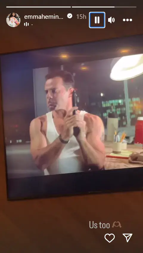 In response, Emma then took to her Instagram Stories to share a clip of the family gathered also watching the debated Christmas classic, Die Hard, along with the words, "Us too".
