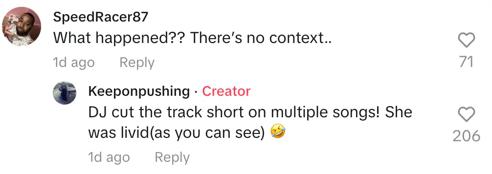 With little context in the video, fans were confused as to where her anger even came from, so the video uploaded explained: "DJ cut the track short on multiple songs! She was livid (as you can see)."
