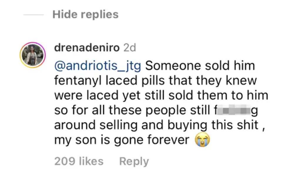 Taking to Instagram to respond to a commenter who asked how her young son died, grieving mom Drena alleged that the cause of his death was due to pills tainted with fentanyl.