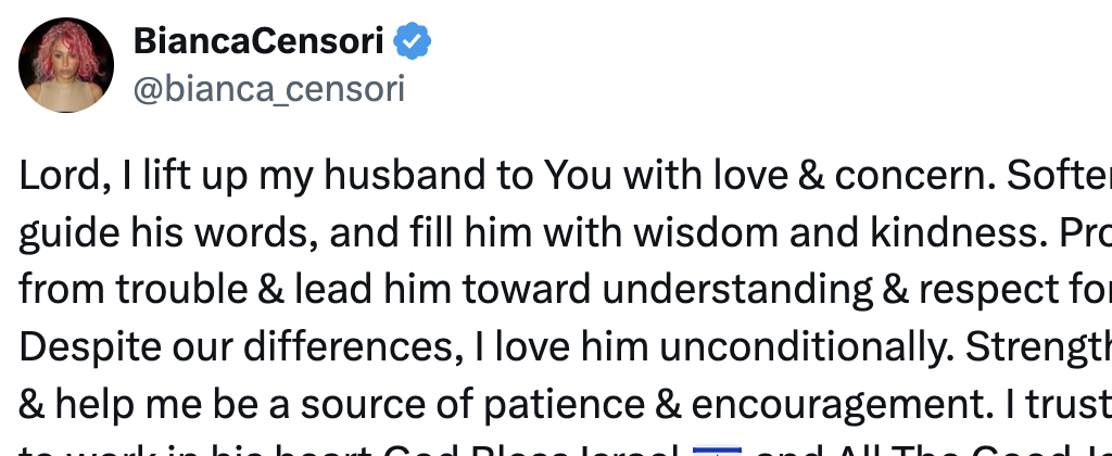 Taking to X (formerly Twitter), Censori shared a prayer for West's well-being and wisdom.