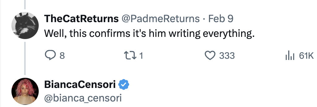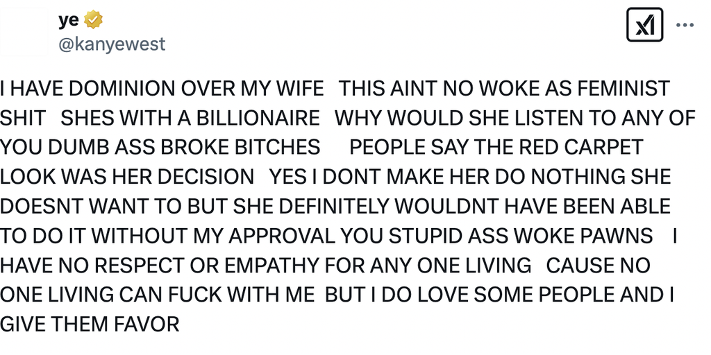 Kanye then went on to claim he has "dominion" over his wife, Bianca. The rapper stated: "I HAVE DOMINION OVER MY WIFE. THIS AIN'T NO WOKE A** FEMINIST S***. SHE'S WITH A BILLIONAIRE, WHY WOULD SHE LISTEN TO ANY OF YOU DUMB*** BROKE B*****. PEOPLE SAY THE RED CARPET LOOK WAS HER DECISION. YES I DON'T MAKE HER DO NOTHING. SHE DOESN'T WANT TO, BUT SHE DEFINITELY WOULDN'T HAVE BEEN ABLE TO DO IT WITHOUT MY APPROVAL.
