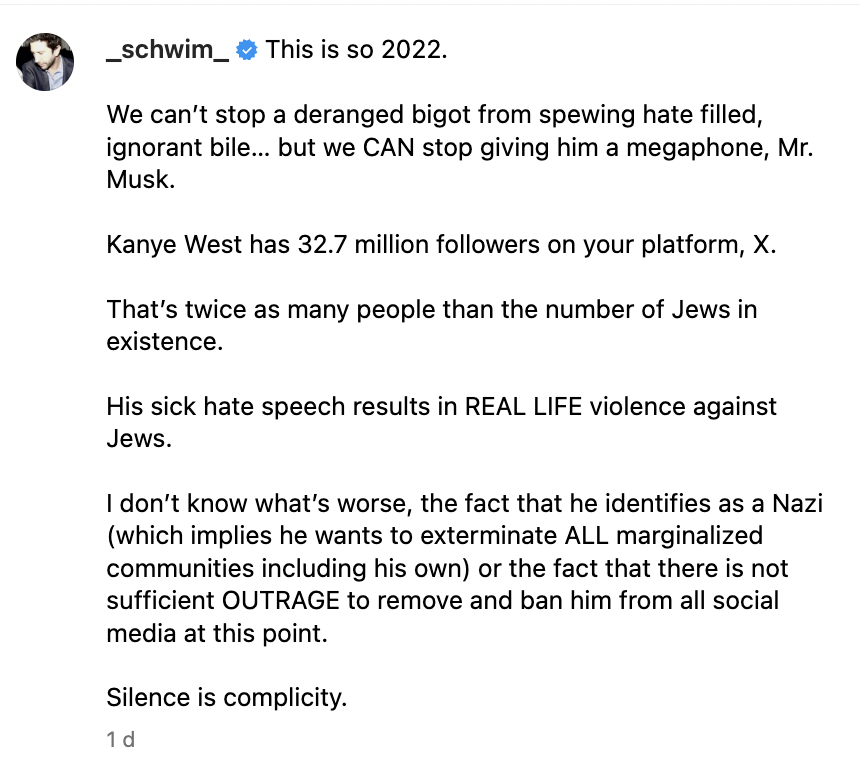 “We can’t stop a deranged bigot from spewing hate filled, ignorant bile… but we CAN stop giving him a megaphone, Mr. Musk,” Schwimmer wrote on Instagram. “Kanye West has 32.7 million followers on your platform, X. That’s twice as many people than the number of Jews in existence. His sick hate speech results in REAL LIFE violence against Jews.”