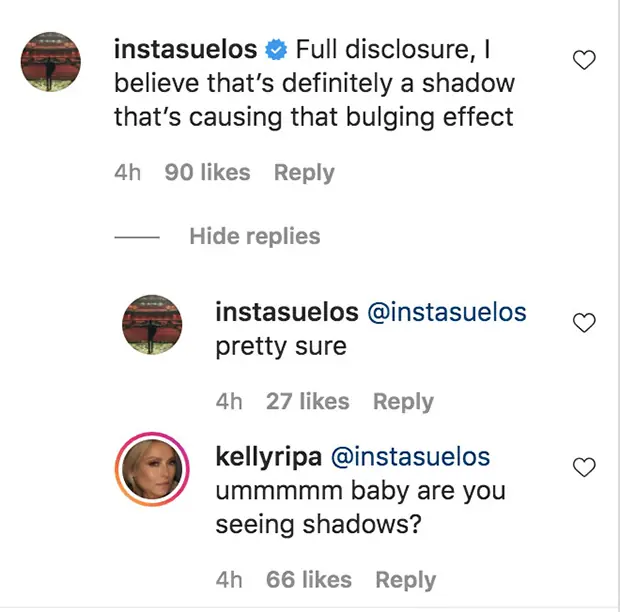 "Ummmm baby are you seeing shadows." she writes, casting doubt on Consuelos' claim that it was a "shadow" causing the "bulging effect".