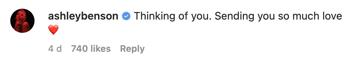 A number of celebs have since taken to the comments to share their condolences, with Pretty Little Liars alum Ashley Benson writing: "Thinking of you. Sending you so much love."