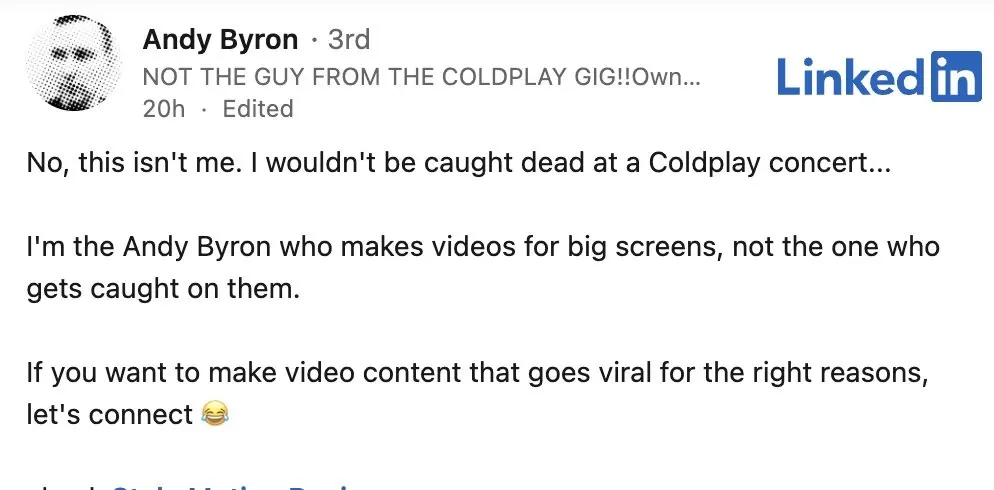 He went on to add: "I'm the Andy Byron who makes videos for big screens, not the one who gets caught on them. If you want to make video content that goes viral for the right reasons, let's connect," ending his post with a crying-laughing emoji.