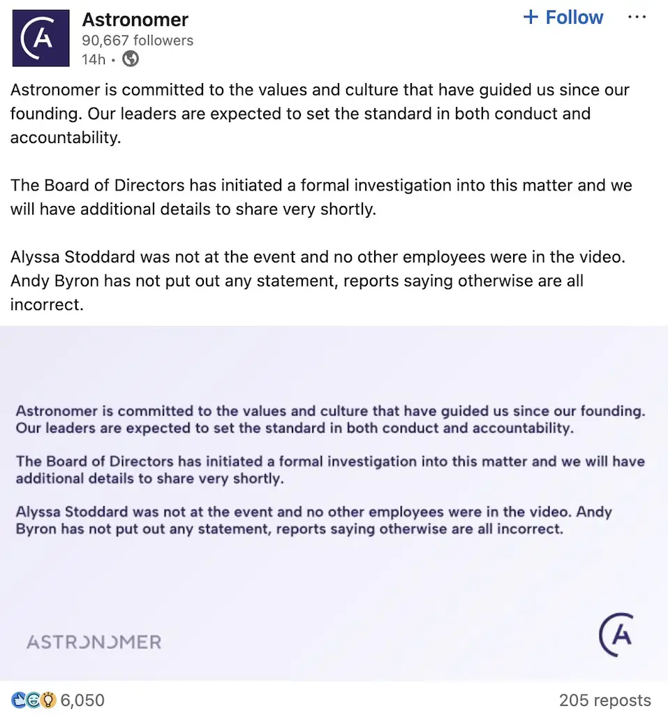 While those at the concert, and now millions of people online, have had a good laugh at the situation, Astronomer has had to take it far more seriously.