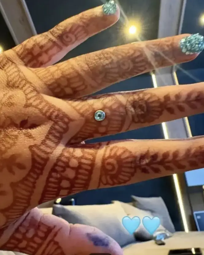 Images show two silver studs embedded in her skin and another design featuring a blue stone centered on her middle finger.
