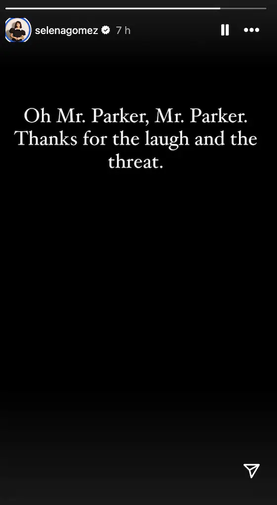 Gomez did not stay silent, responding to Parker’s comments via Instagram Stories. “Oh Mr. Parker, Mr. Parker. Thanks for the laugh and the threat," she wrote.
