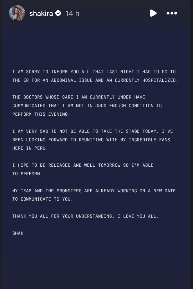 The news was broken to fans on Shakira's Instagram Story, where she apologized for canceling just hours before she was due to take the stage.