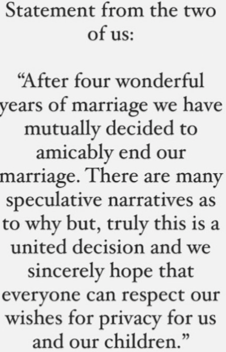 "There are many speculative narratives as to why but, truly this is a united decision and we sincerely hope that everyone can respect our wishes for privacy for us and our children."