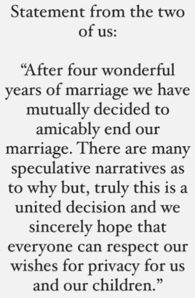 "There are many speculative narratives as to why but, truly this is a united decision and we sincerely hope that everyone can respect our wishes for privacy for us and our children."