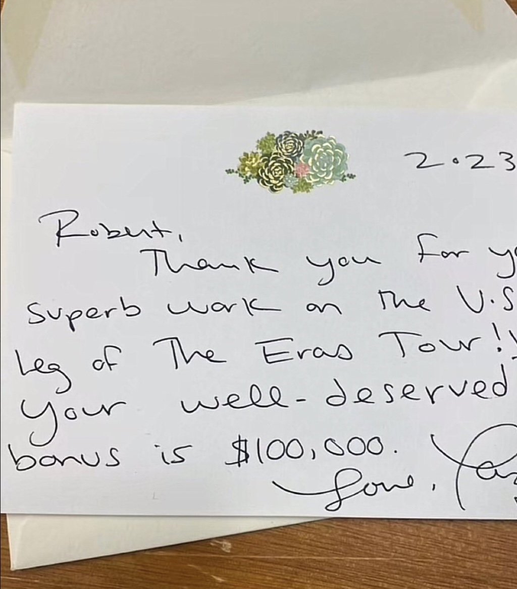 The note, shared by PopBase on X (formerly Twitter), read: "Robert, Thank you for your superb work on the U.S. leg of The Eras Tour!! Your well-deserved bonus is $100,000. Love, Taylor.”