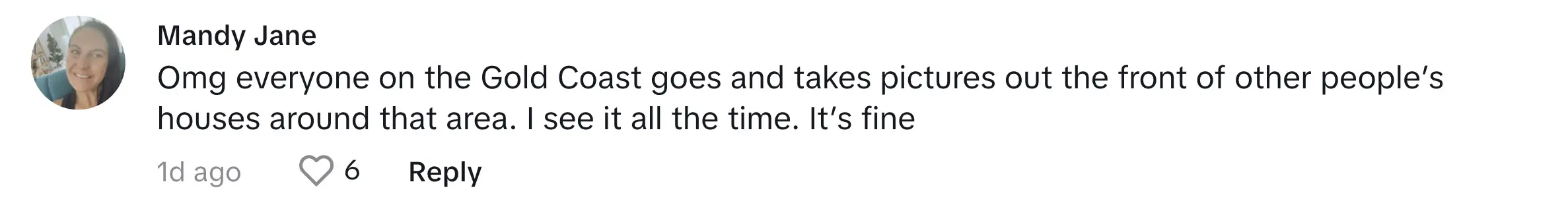 "Omg everyone on the Gold Coast goes and takes pictures out the front of other people’s houses around that area. I see it all the time. It’s fine," one person wrote.