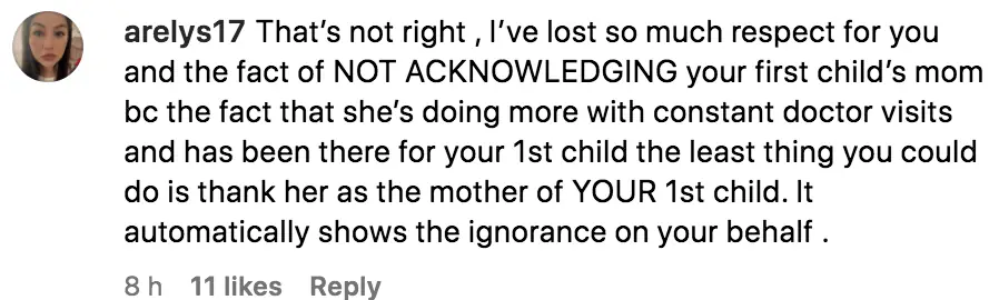 One fan wrote: "That’s not right, I’ve lost so much respect for you and the fact of NOT ACKNOWLEDGING your first child’s mom bc the fact that she’s doing more with constant doctor visits and has been there for your 1st child the least thing you could do is thank her as the mother of YOUR 1st child. It automatically shows the ignorance on your behalf."