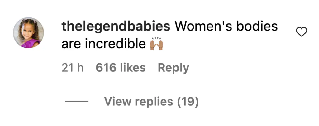 And this user was incredibly grateful for Teigen's post: "Thank you for this picture! Second time mama with a 3 month old and I feel like I don’t recognize this body. Bounce back culture is causing me to have a lot of self disapproval and to see a celeb with all the resources in the world show such a real pic makes me feel like I’m right where I need to be."