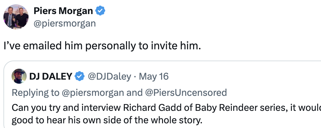 Following the controversial interview, fans urged Morgan to also interview Richard Gadd to present his side of the story. In response, Morgan revealed on social media that he has reached out to Gadd with a personal invitation to appear on his talk show.
