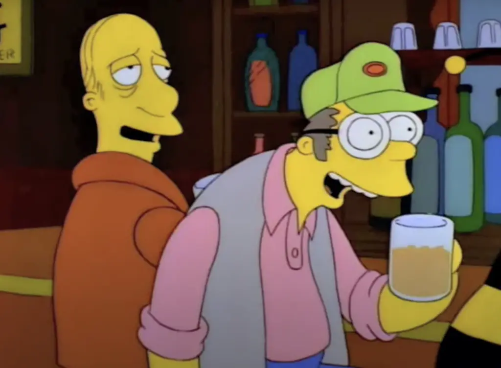 Often seen clad in a dark red jacket, Larry would frequent Moe's Tavern, sharing the screen with Homer, Barney, Lenny, and Carl, albeit in a largely silent role.