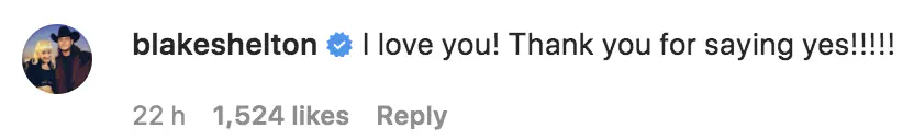 In the video clip, Shelton can be seen pulling back Stefani's wedding veil before the video cuts to the couple dancing and sharing a kiss. The No Doubt singer also tagged Shelton, who replied: "I love you! Thank you for saying yes!!!!!"