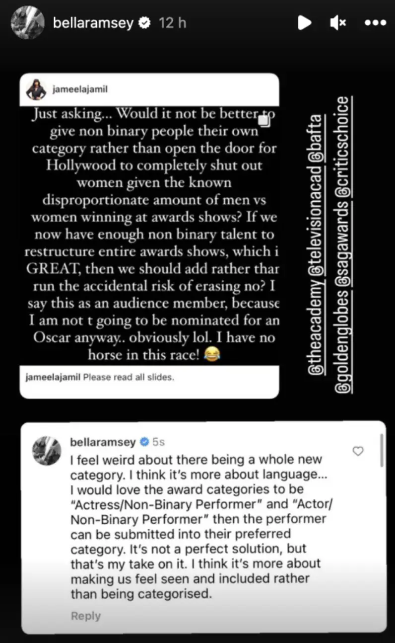 The Last of Us star Bella Ramsey, who identifies as non-binary, hopped in on the conversation, responding to Jamil's proposal. "I feel weird about there being a whole new category. I think it's more about language," they said. "I would love the categories to be 'Actress/Non-Binary Performer' and 'Actor/Non-Binary Performer' then the performer can be submitted into their preferred category."