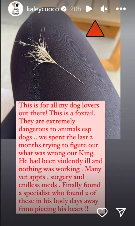 The Flight Attendant star showed an image of a wispy foxtail plant on her leg, and wrote: "They are extremely dangerous to animals esp dogs .. we spent the last 2 months trying to figure out what was wrong [with] our King."