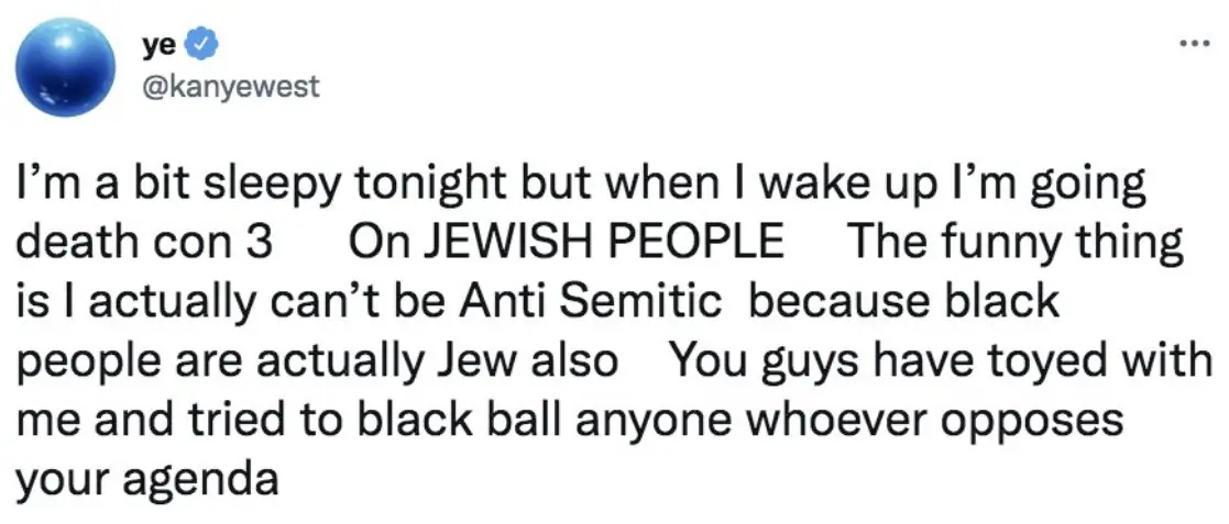 In the same tweet that was later removed and replaced with text that said it infringed the policies, West alleged that he wasn’t "Anti Semitic because black people are actually [Jews]."