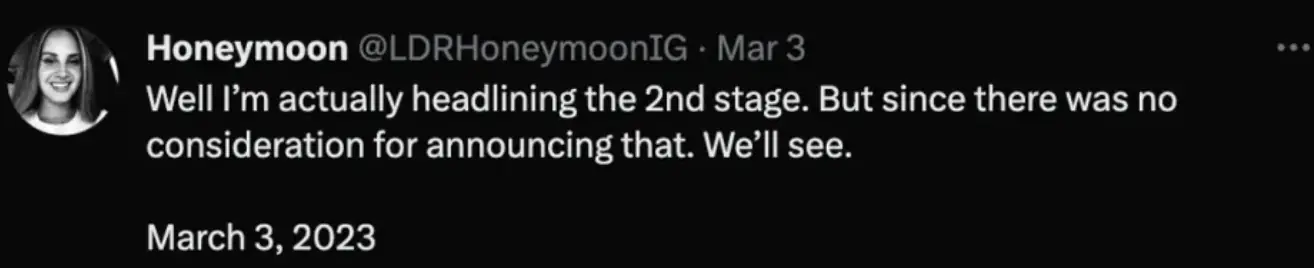 Following the release of the lineup, the 37-year-old reportedly stated on her private Instagram: "Well, I'm actually headlining the 2nd stage. But, since there was no consideration for announcing that we'll see."