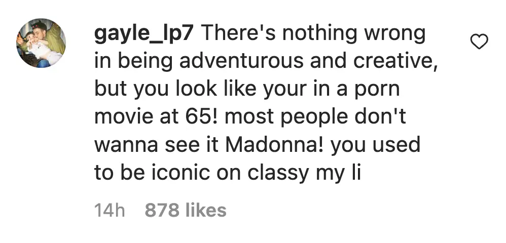 "There's nothing wrong in being adventurous and creative, but you look like your in a porn movie at 65! most people don't wanna see it Madonna! you used to be iconic [and] classy..." wrote one user.