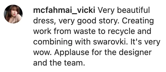 "Creating work from waste to recycle and combining with swarovki. It's very wow. Applause for the designer and the team."