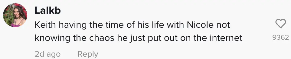 Fans quickly went wild on social media with one humorously commenting: "Keith having the time of his life with Nicole not knowing the chaos he just put out on the internet."
