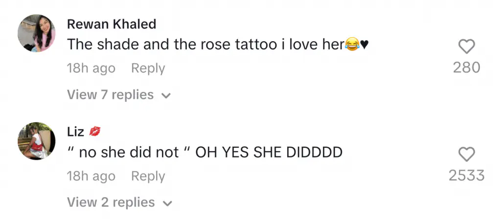 "The shade and the rose tattoo i love her," commented one user while another agreed, adding: "'No she did not' OH YES SHE DIDDDD."