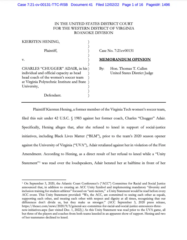 A judge recently ruled in favor of a former Virginia Tech women's soccer player after she filed a lawsuit against her former coach for benching her due to her political views.