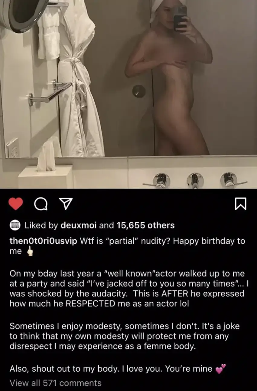 "On my bday last year a 'well known' actor walked up to me at a party and said, 'I've j**ked off to you so many times'. I was shocked by the audacity," she revealed. "This is AFTER he expressed how much he RESPECTED me as an actor lol."