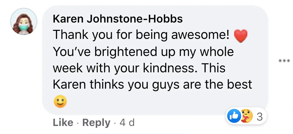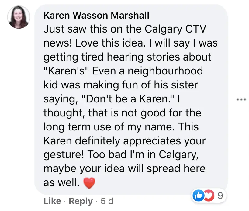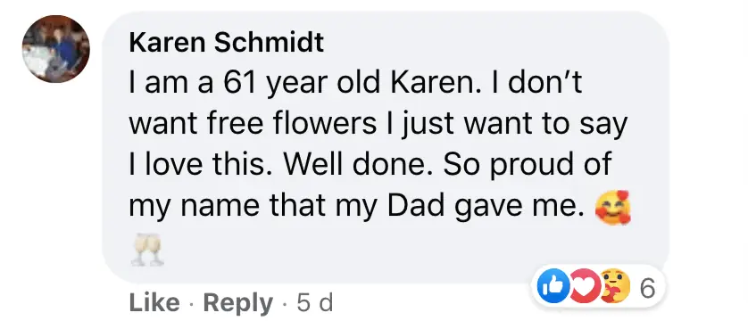 For example, one Facebook user wrote: "I am a Karen and want to thank you for showing the love.