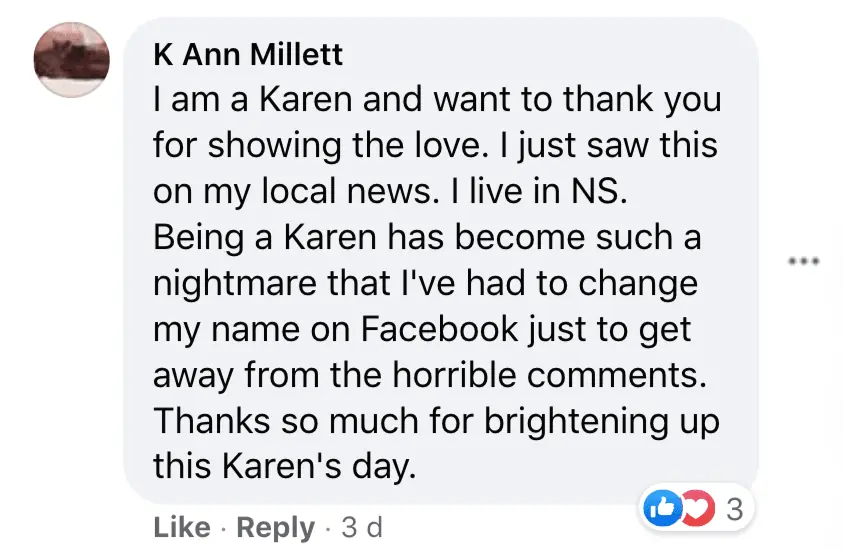 "Being a Karen has become such a nightmare that I've had to change my name on Facebook just to get away from the horrible comments. Thanks so much for brightening up this Karen's day."