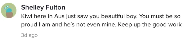 Shelley Fulton said: "Kiwi here in [Australia]. Just saw you [sic] beautiful boy. You must be so proud. I am and he's not even mine. Keep up the good work."