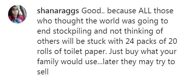 And followers seemed gratified by the move. One wrote, "Good.. because ALL those who thought the world was going to end stockpiling and not thinking of others will be stuck with 24 packs of 20 rolls of toilet paper. Just buy what your family would use...later they may try to sell".