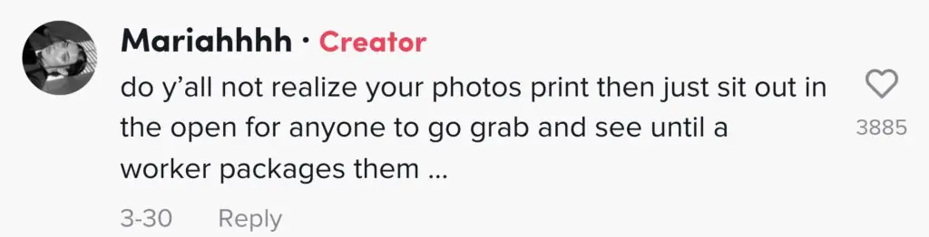 In a follow-up comment on the post, the CVS worker adds: "do y’all not realize your photos print then just sit out in the open for anyone to go grab and see until a worker packages them."