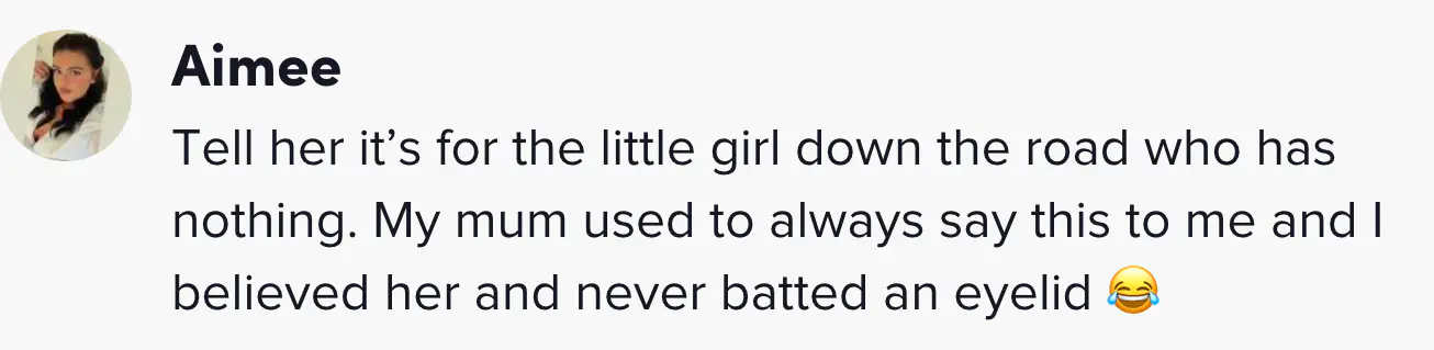 One person said: "Tell her it’s for the little girl down the road who has nothing. My mum used to always say this to me and I believed her and never batted an eyelid."