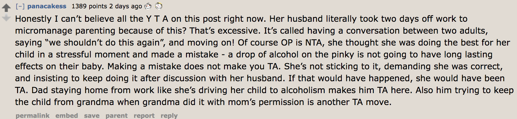 "Dad staying home from work like she’s driving her child to alcoholism makes him TA here. Also, him trying to keep the child from grandma when grandma did it with mom’s permission is another TA move," the user continued.