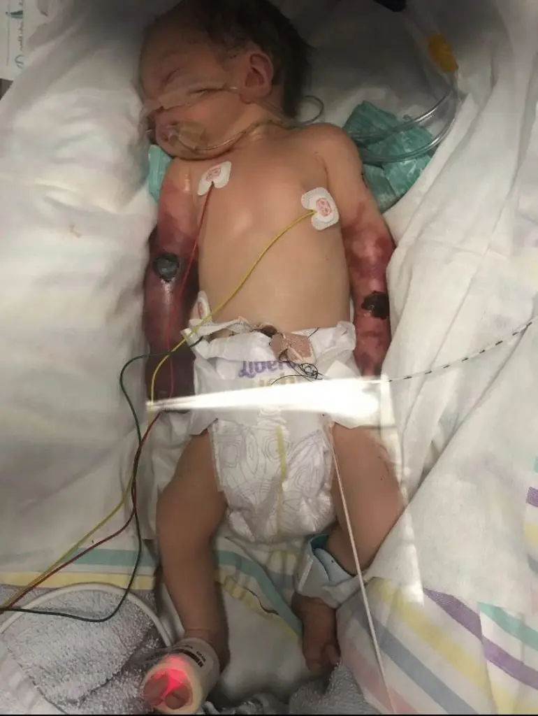 After six operations, baby Darcie now has just her thumb and index finger on her left hand, and her right arm has been amputated from the forearm. Sadly, she will still need to undergo further operations on her right arm until the deteriorated skin is completely removed and replaced with healthy skin grafts.