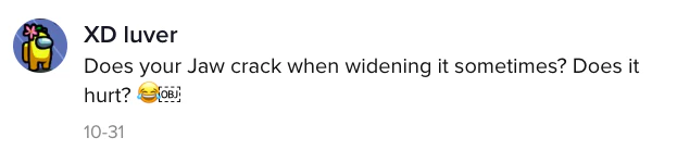 One of the questions she responded to was from a user who goes by the username XD luver. They asked: "Does your jaw crack when widening it sometimes? Does it hurt?"