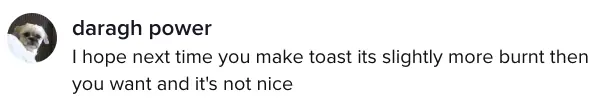 One user named Daragh Power seemed to take personal offense to the cooking technique, telling the TikToker: "I hope the next time you make toast its [sic] slightly more burnt then [sic] you want and it's not nice."