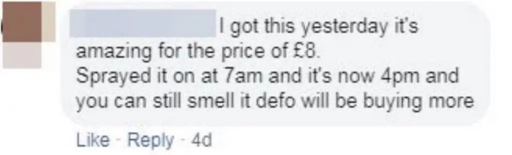 "Sprayed a sample in the shop & it’s still smelling strong hour half later so I’ve brought it- the perfume smells better than the spray but both are."