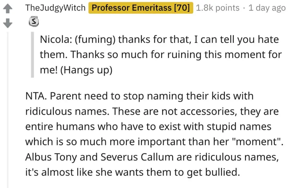 One person replied: "NTA [Not the a**hole]. Parents need to stop naming their kids with ridiculous names. These are not accessories, they are entire humans who have to exist with stupid names which is so much more important than her 'moment'.