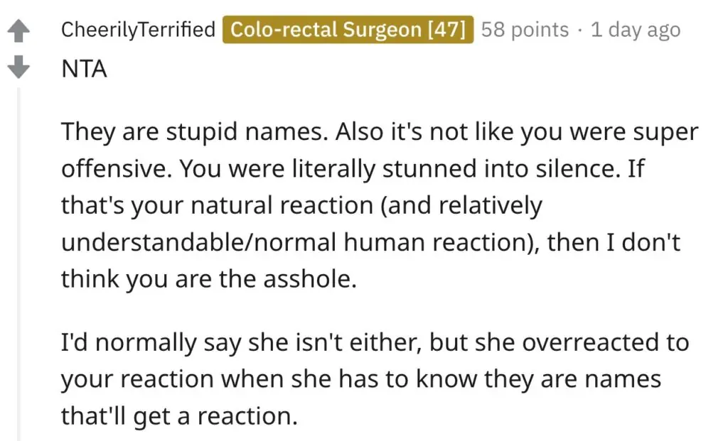 Meanwhile, a third typed: "NTA. They are stupid names. Also, it's not like you were super offensive. You were literally stunned into silence. If that's your natural reaction (and relatively understandable/normal human reaction), then I don't think you are the a**hole."
